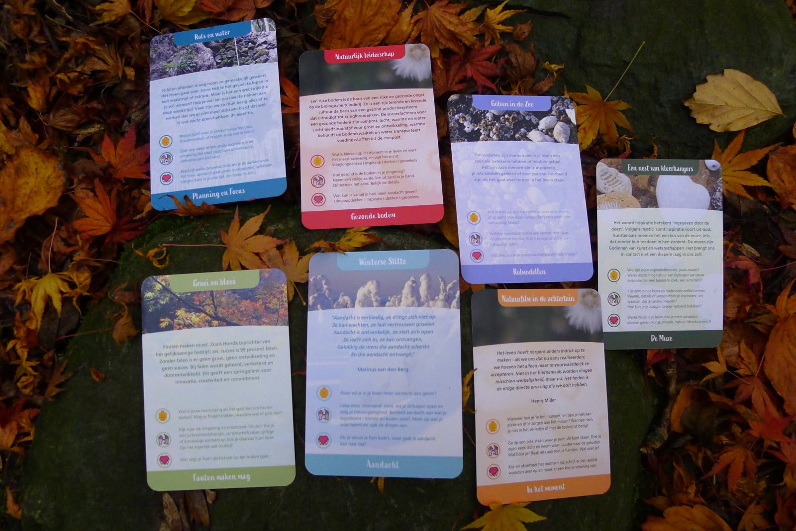 - De combinatie met de natuur en de vragen en foto’s leveren verrassende inzichten op het gebied van bezinning en rust, creativiteit, ontwikkeling, natuurlijk leiderschap, samenwerken, verwondering en schoonheid, kracht, energie en ritme.
